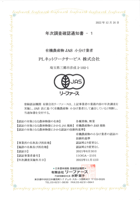 これによりPLネットワークサービスは高品質で安全な食品を提供する事と環境に配慮した持続可能な農業を支援する事を証明しています